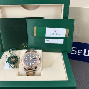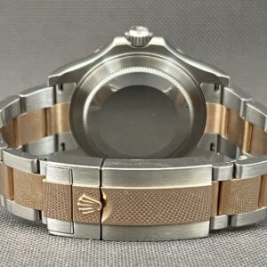 Den elegante Yacht-Master 40 i rosa guld og stål med en lækker mat sort skive med rød skrift. Det automatiske værk yder 48 timers gangreserve. Vandtæthed til 100m.