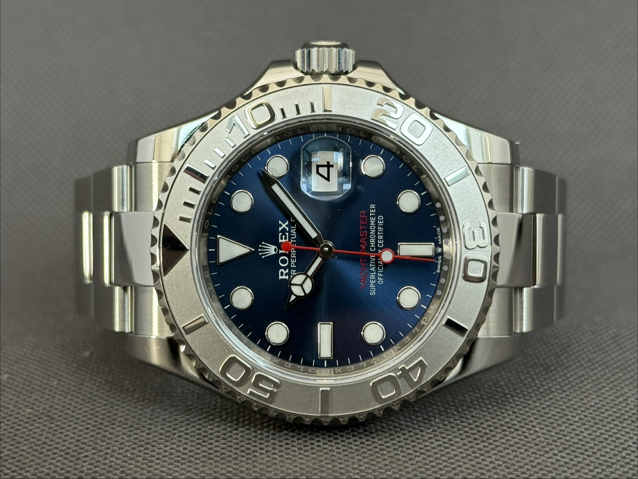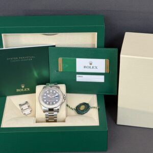 Nyeste version af Yacht-Master 40 med den flotte blå skive samt bezel udført i platin. Inde i kassen sidder det nye Caliber 3235 som yder en gangreserve på 70 timer og vandtæthed til 100m.
