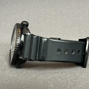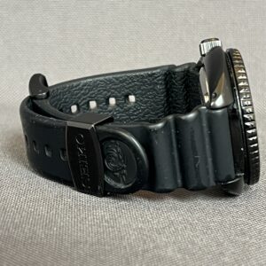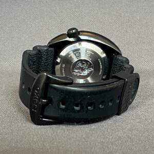 En limiteret udgave, som blev hurtigt udsolgt verden over tilbage i 2018. Seiko Ninja Turtle er pvd behandlet stål med silicone rem. Mat sort skive med “patina” indeks, hvid timeviser og orange minutviser. Automatisk værk med dag og dato. Vandtæthed til 200m.