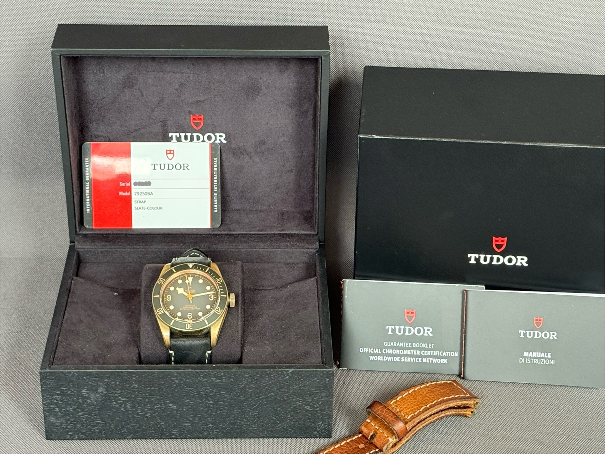 Tilbehør: Bokse, papirer, certifikat, ekstra org. brun Tudor læderrem.