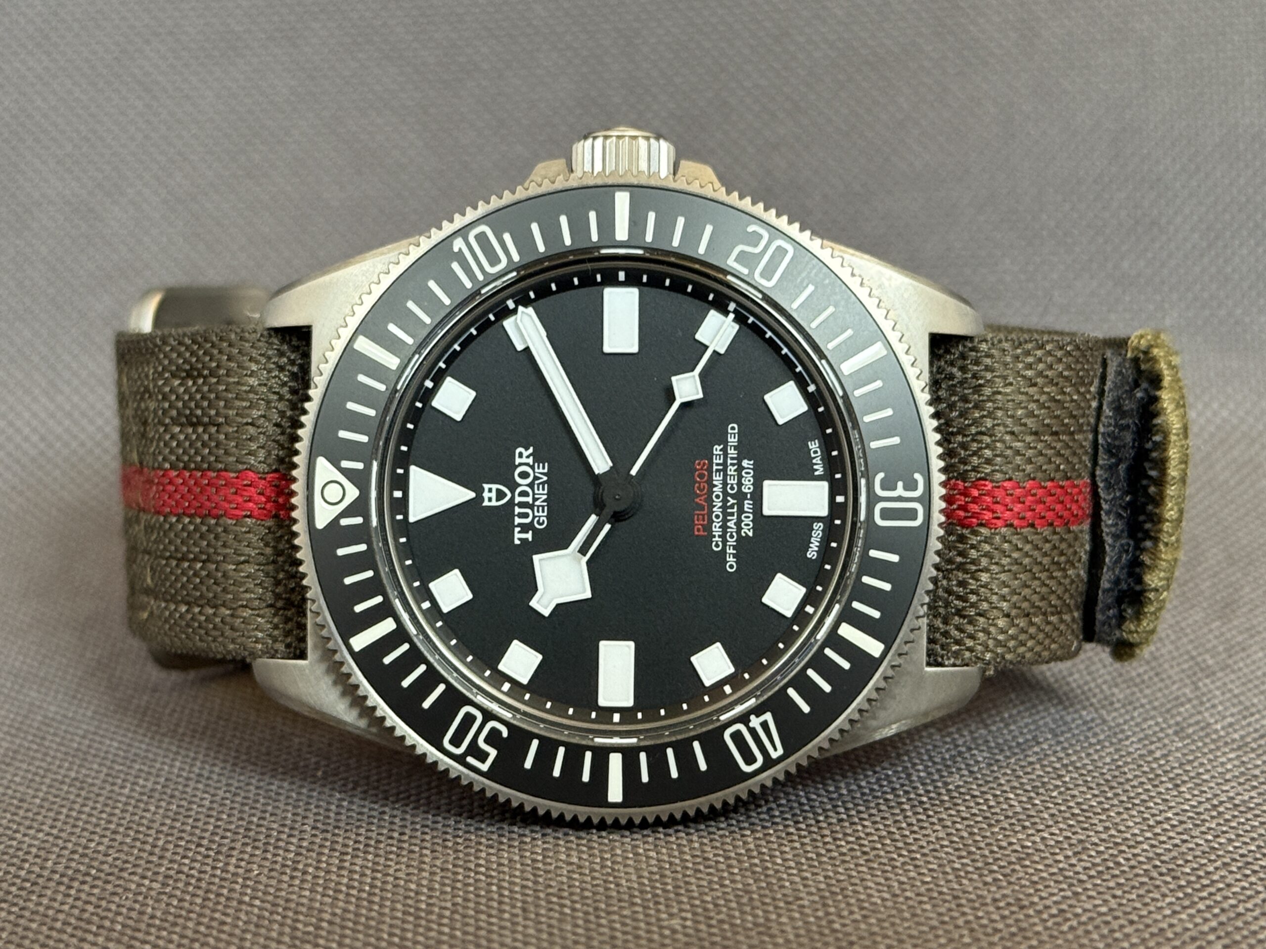 Flot eksemplar af Tudor Pelagos FXD, et 42 mm dykkerur udført i titanium med sort matt skive og keramisk lynette. Uret er monteret på den originale NATO-rem, og den originale Tudor gummirem medfølger. Inde bag titaniumkassen sidder Tudors MT5602-kaliber, som yder 70 timers gangreserve og er COSC-certificeret. Vandtæt til 200 meter.