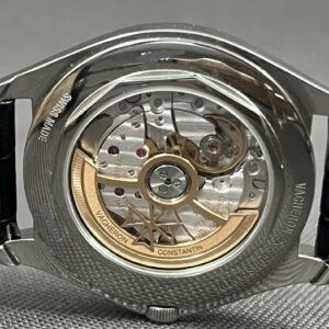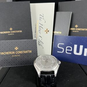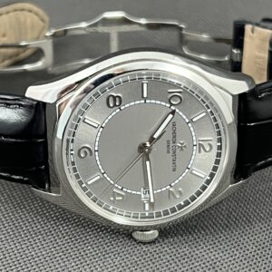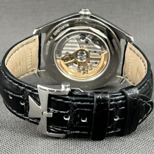 Et vanvittig lækkert dress watch fra VC i stål med sølv skive, gennemsigtig bagkasse og dobbelt foldelås. Et smukt automatisk værk med 22 karat guld rotor med logo. Det yder 48 timers gangreserve. Vandtæthed 30m.
